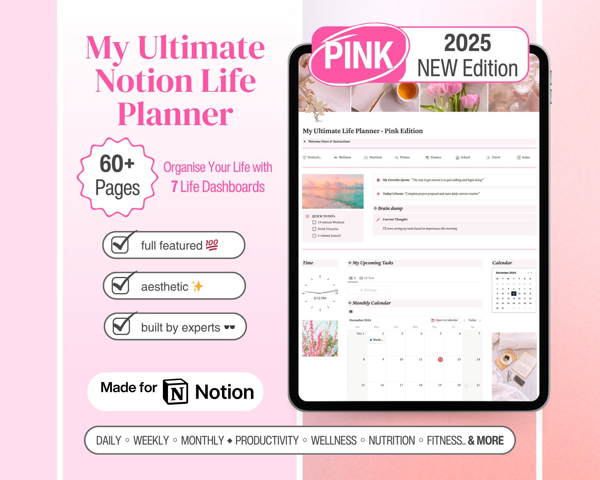 Tired of juggling tasks, goals, and plans without a system that works? Meet your new best friend β€” the Notion Ultimate Life Planner! Designed to seamlessly integrate into the powerful Notion app, this all-in-one digital planner will revolutionize the way you stay organized, productive, and inspired every single day.